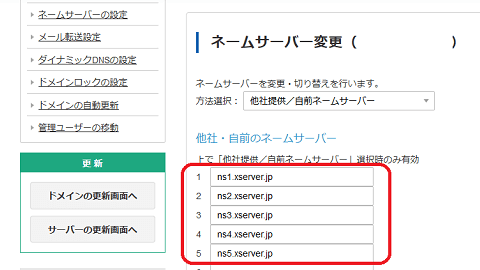 次に、取得したドメインの事業者側で「①で確認したネームサーバー」を設定します。